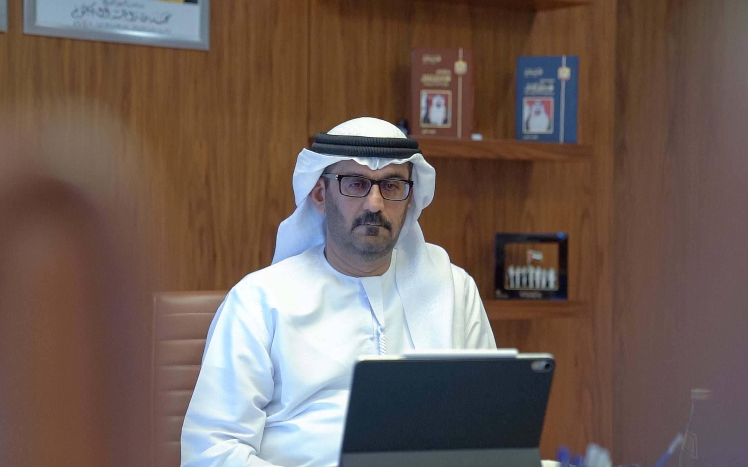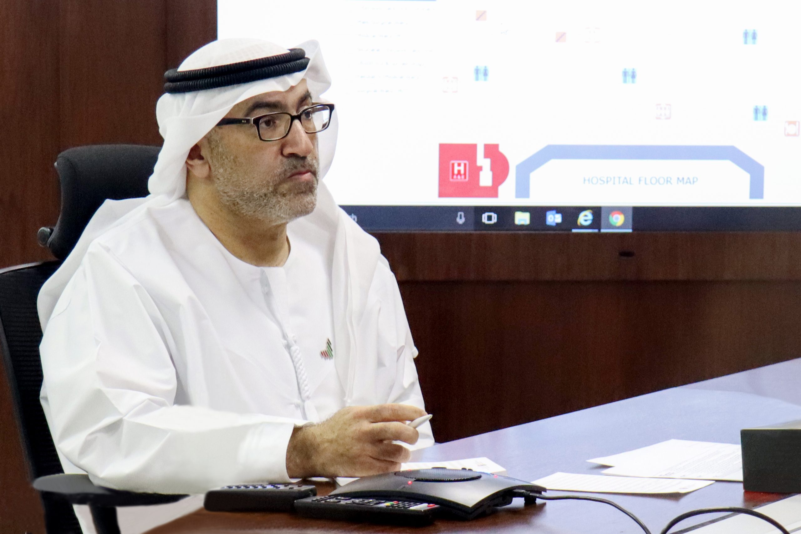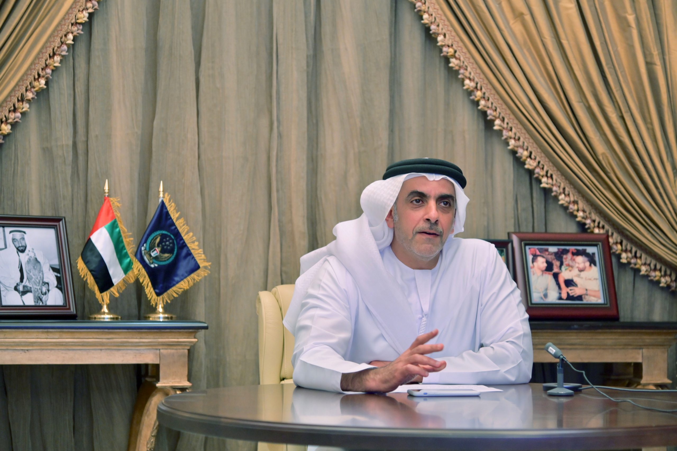ABU DHABI, UNITED ARAB EMIRATES – March 29, 2020: HE Obaid Rashid AL Hassan Al Shamsi, Director General of the National Emergency and Crisis and Disasters Management Authority (NCEMA) (L), participates in a video conference briefing for HH Sheikh Mohamed bin Zayed Al Nahyan, Crown Prince of Abu Dhabi and Deputy Supreme Commander of the UAE Armed Forces (not shown), on the latest national efforts to combat Covid-19.