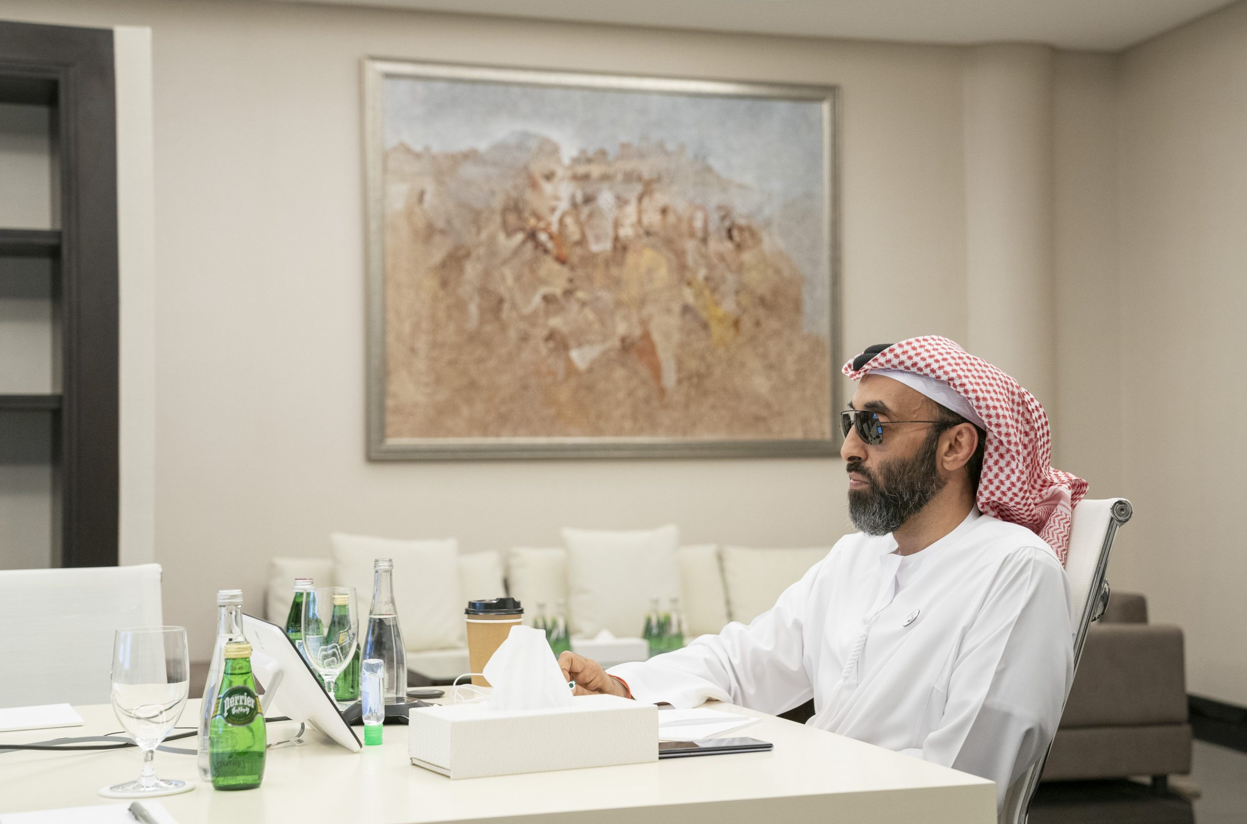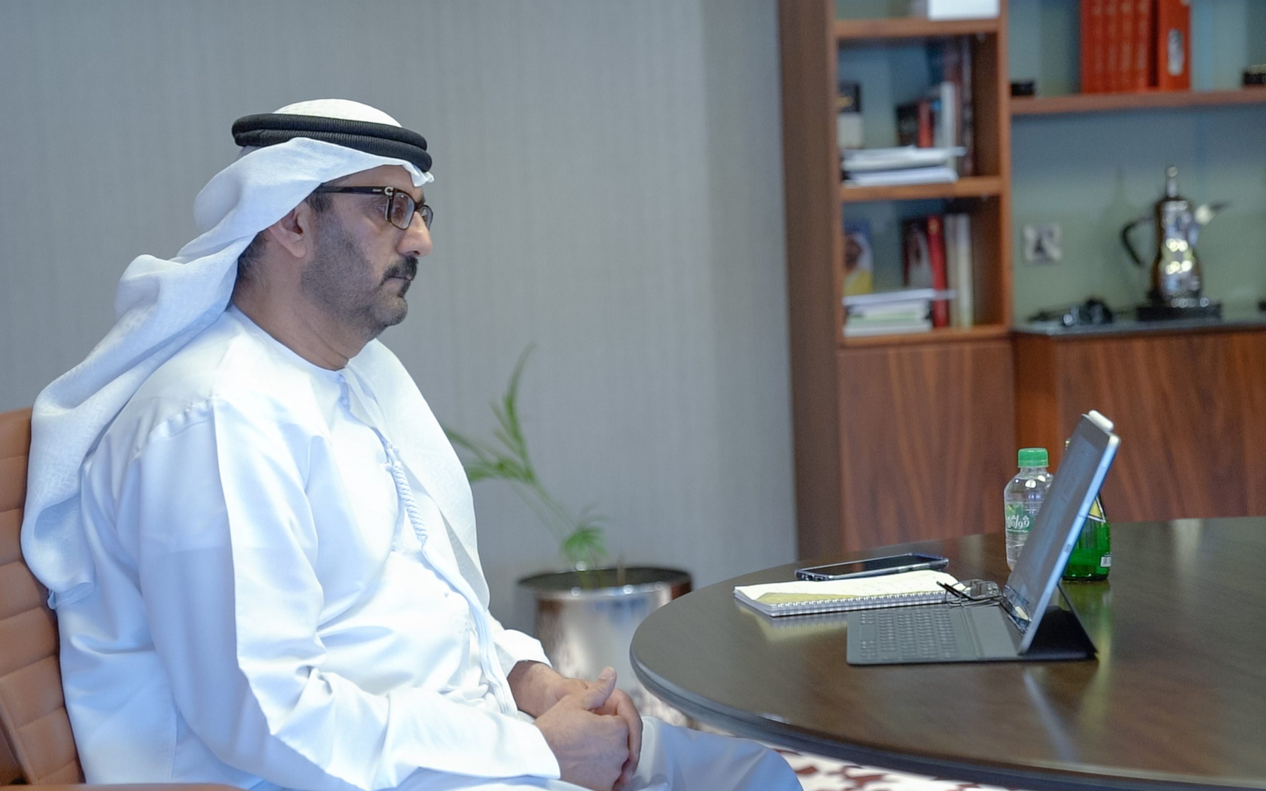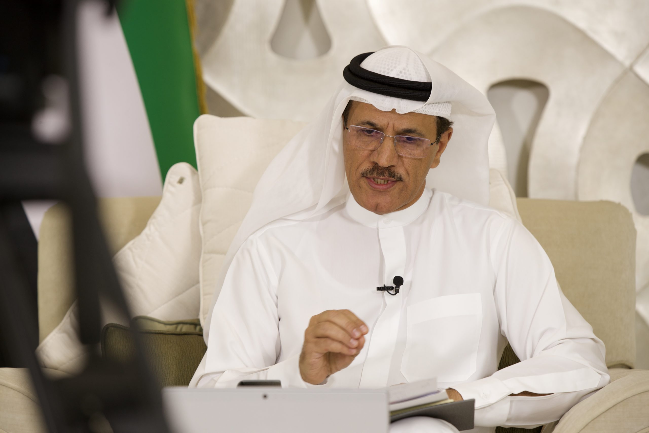 ABU DHABI, UNITED ARAB EMIRATES – March 29, 2020: HE Sultan bin Saeed Al Mansouri, UAE Minister of Economy (R), participates in a video conference briefing for HH Sheikh Mohamed bin Zayed Al Nahyan, Crown Prince of Abu Dhabi and Deputy Supreme Commander of the UAE Armed Forces (not shown), on the latest national efforts to combat Covid-19.