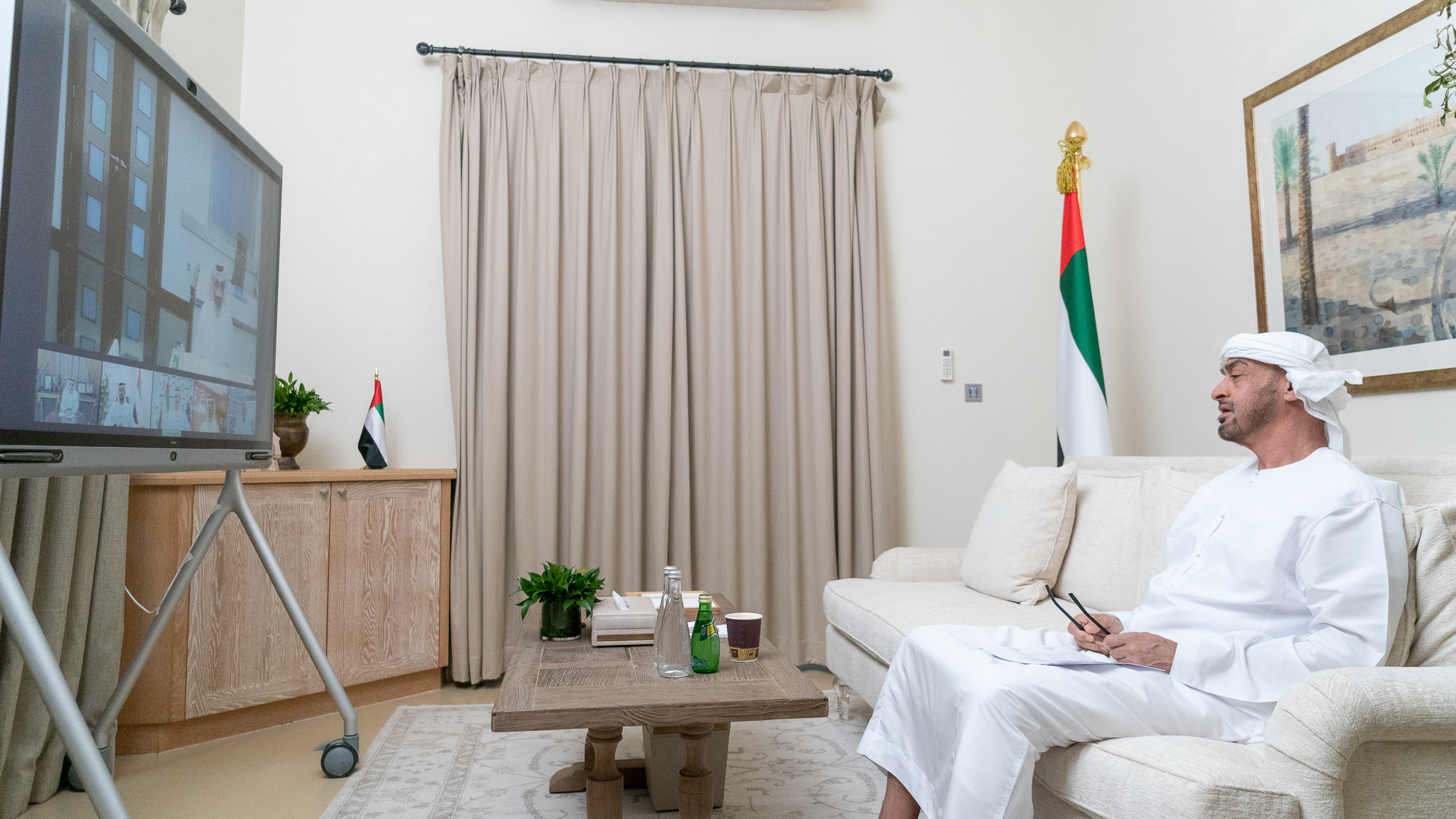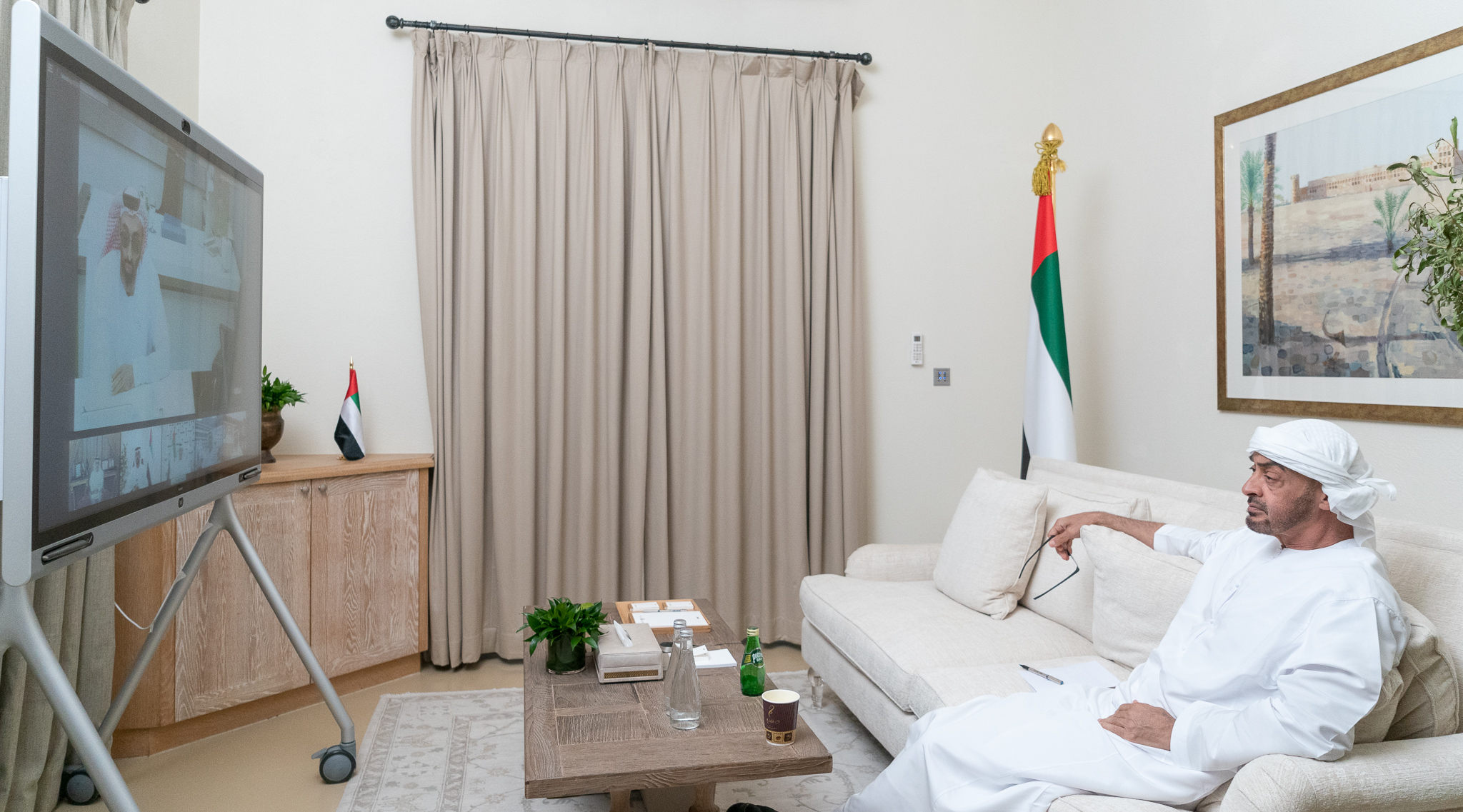 ABU DHABI, UNITED ARAB EMIRATES – March 29, 2020: HH Sheikh Tahnoon bin Zayed Al Nahyan, UAE National Security Advisor (R), participates in a video conference briefing for HH Sheikh Mohamed bin Zayed Al Nahyan, Crown Prince of Abu Dhabi and Deputy Supreme Commander of the UAE Armed Forces (not shown), on the latest national efforts to combat Covid-19.